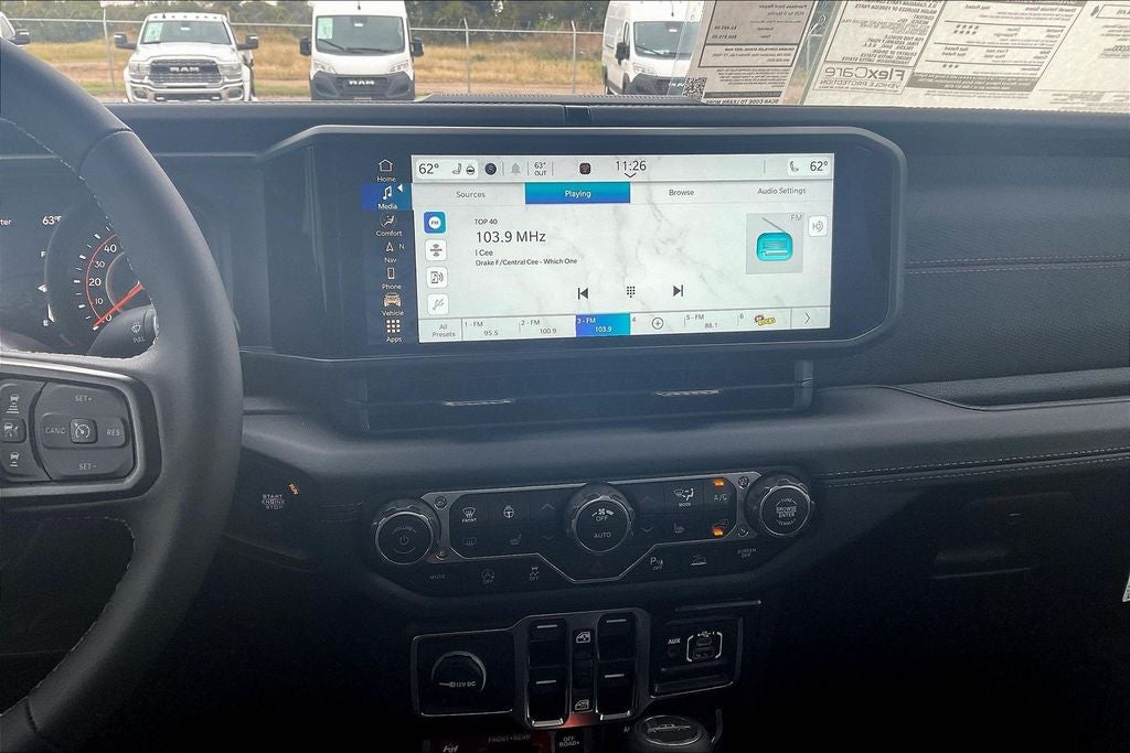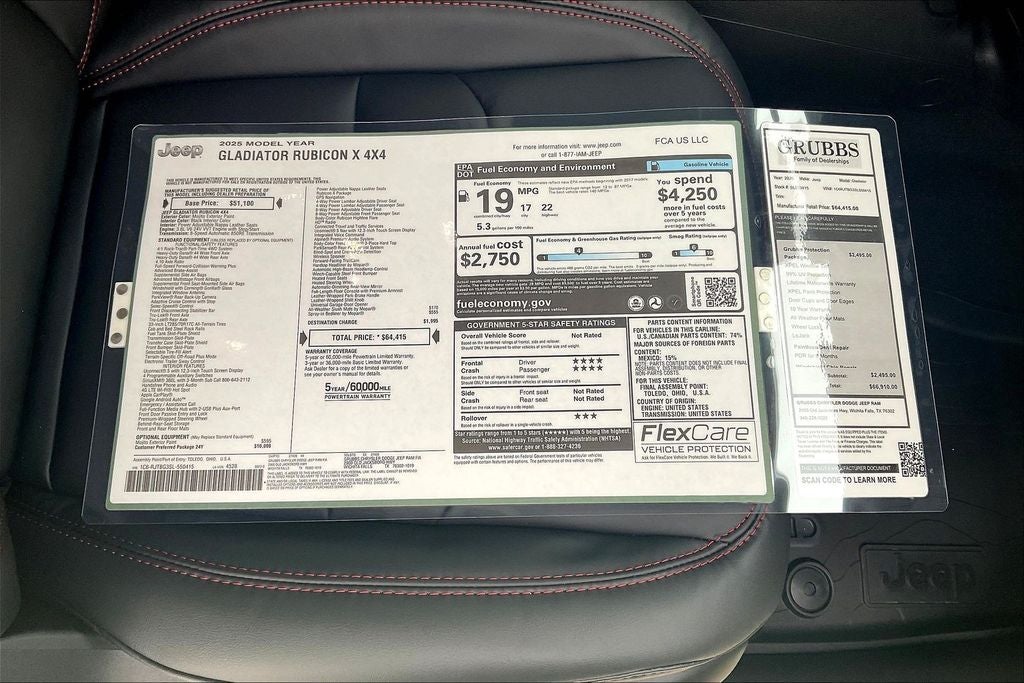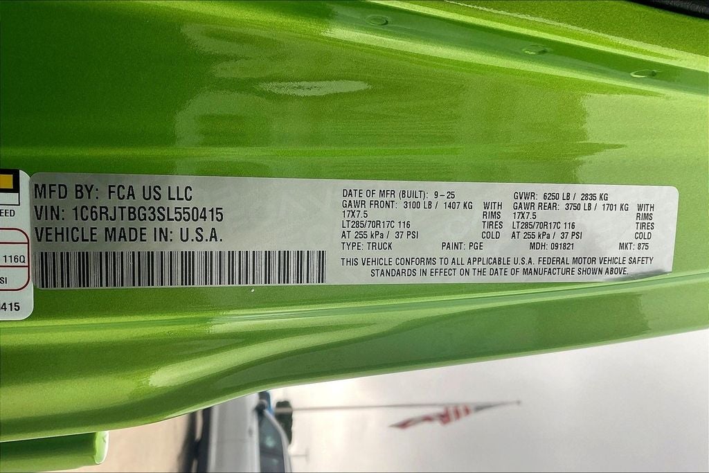 2025 Jeep Gladiator Rubicon 4D Crew Cab Rubicon Mojito 4WD 8-Speed Automatic 3.6L V6 24V VVT 4G LTE Wi-Fi Hot Spot, Air Conditioning, Alexa Built-In, Alpine Premium Audio System, Apple CarPlay, Auto High Beam Headlamp Control, Auto-Dimming Rear-View Mirror, Automatic temperature control, Blind Spot & Cross Path Detection, Bluetooth® Wireless Speaker, Body Color 3-Piece Hard Top, Body Color Rubicon Highline Flare, Cloth Low-Back Bucket Seats, Connected Travel & Traffic Services, Connectivity - US/Canada, Delay-off headlights, Electronic Stability Control, Freedom Panel Storage Bag, Front dual zone A/C, Front fog lights, Full Length Floor Console Premium Armrest, Fully automatic headlights, Google Android Auto, GPS Navigation, Heated Front Seats, Heated Steering Wheel, Integrated Off-Road Camera, Integrated Voice Command w/Bluetooth®, Leather Wrapped Park Brake Handle, Leather Wrapped Shift Knob, MOPAR Hardtop Headliner, ParkSense Rear Park Assist System, Power 4-Way Driver Lumbar Adjust, Power 4-Way Passenger Lumbar Adjust, Power Adjust 8-Way Driver Seat, Power Adjust 8-Way Front Passenger Seat, Power Adjust Nappa Leather Seats, Power steering, Power windows, Premium Door Trim Panel, Quick Order Package 24Y Rubicon X, Radio data system, Radio: Uconnect 5 Nav w/12.3 Display, Radio: Uconnect 5 w/12.3 Display, Rear Armrest w/Cupholder Seat, Rear Sliding Window, Rear Window Defroster, Remote keyless entry, SiriusXM Radio Service, SiriusXM w/360L, Steel Front Bumper, Steering wheel mounted audio controls, Universal Garage Door Opener, USB Host Flip.