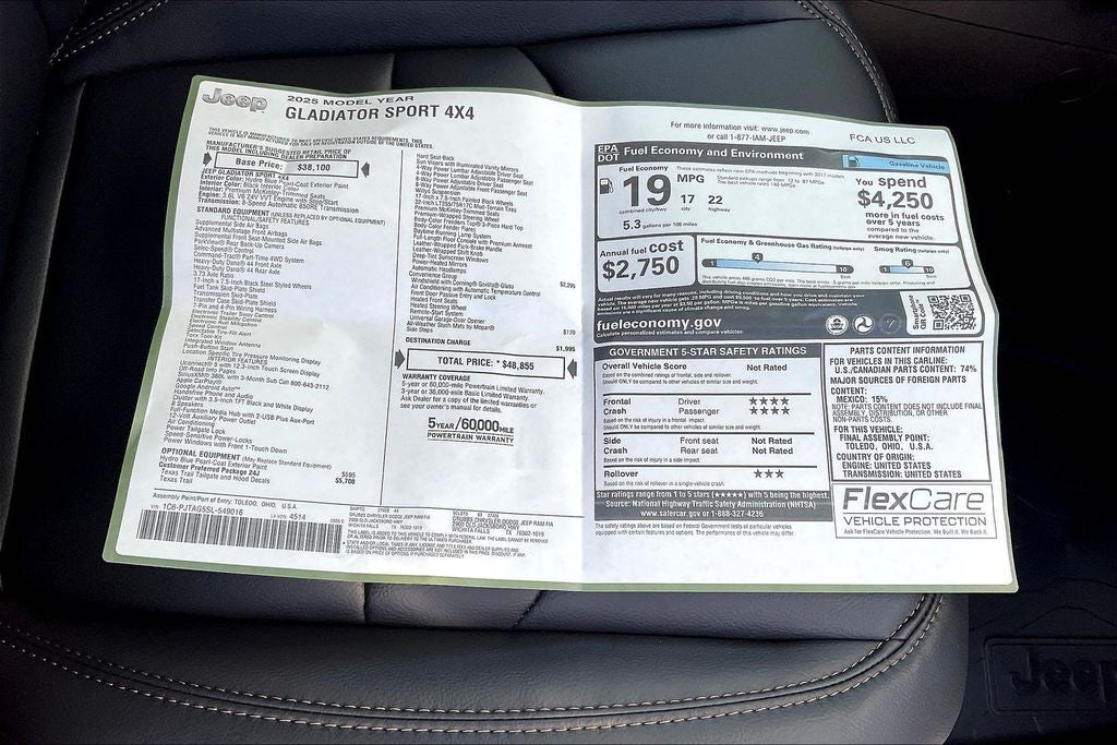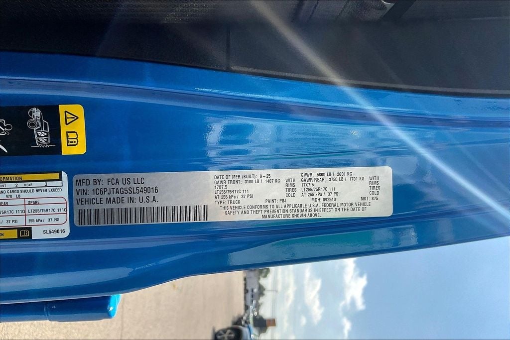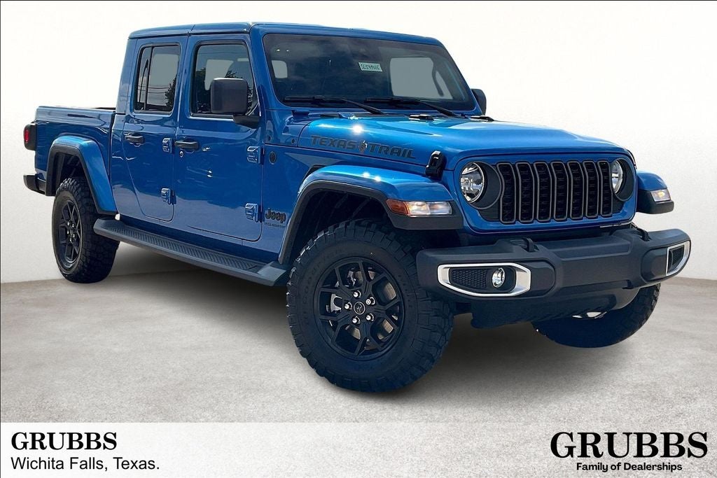 2025 Jeep Gladiator Texas Trail 4D Crew Cab Texas Trail Hydro Blue Pearlcoat 4WD 8-Speed Automatic 3.6L V6 24V VVT 4-Wheel Disc Brakes, 8 Speakers, 97 MPH Vehicle Max Speed Calibration, ABS brakes, Advanced Brake Assist, Air Conditioning, Air Conditioning w/Auto Temperature Control, Alexa Built-In, AM/FM radio: SiriusXM, Apple CarPlay, Apple CarPlay/Android Auto, Automatic Headlamps, Body Color 3-Piece Hard Top, Body Color Fender Flares (2-Piece), Brake assist, Compass, Convenience Group, Corning Gorilla Glass, Daytime Running Lamp System, Deep Tint Sunscreen Windows, Dual front impact airbags, Dual front side impact airbags, Electronic Stability Control, Emergency/Assistance Call, Freedom Panel Storage Bag, Front anti-roll bar, Front Door Locks 2-Door Passive Entry, Full Length Floor Console Premium Armrest, Full Speed Forward Collision Warning Plus, Hard Seat Back, Heated Front Seats, Heated Steering Wheel, Integrated Radar Camera Module (IRCM), Leather Wrapped Park Brake Handle, Leather Wrapped Shift Knob, Low tire pressure warning, Normal Duty Suspension, ParkView Rear Back-Up Camera, Power 4-Way Driver Lumbar Adjust, Power 4-Way Passenger Lumbar Adjust, Power Adjust 8-Way Driver Seat, Power Adjust 8-Way Front Passenger Seat, Power Heated Mirrors, Power steering, Power windows, Premium Door Trim Panel, Premium McKinley Trimmed Seats, Premium Wrapped Steering Wheel, Quick Order Package 24J Texas Trail, Radio data system, Radio: Uconnect 5 w/12.3 Display, Rear anti-roll bar, Rear Armrest w/Cupholder Seat, Rear Sliding Window, Rear Window Defroster, Remote keyless entry, Remote Start System, Security Alarm, Side Steps, Steering wheel mounted audio controls, Sun Visors w/Illuminated Vanity Mirrors, Texas Trail, Texas Trail Tailgate & Hood Decals, Traction control, Universal Garage Door Opener, Wheels: 17 x 7.5 Painted Black, Willys Suspension.