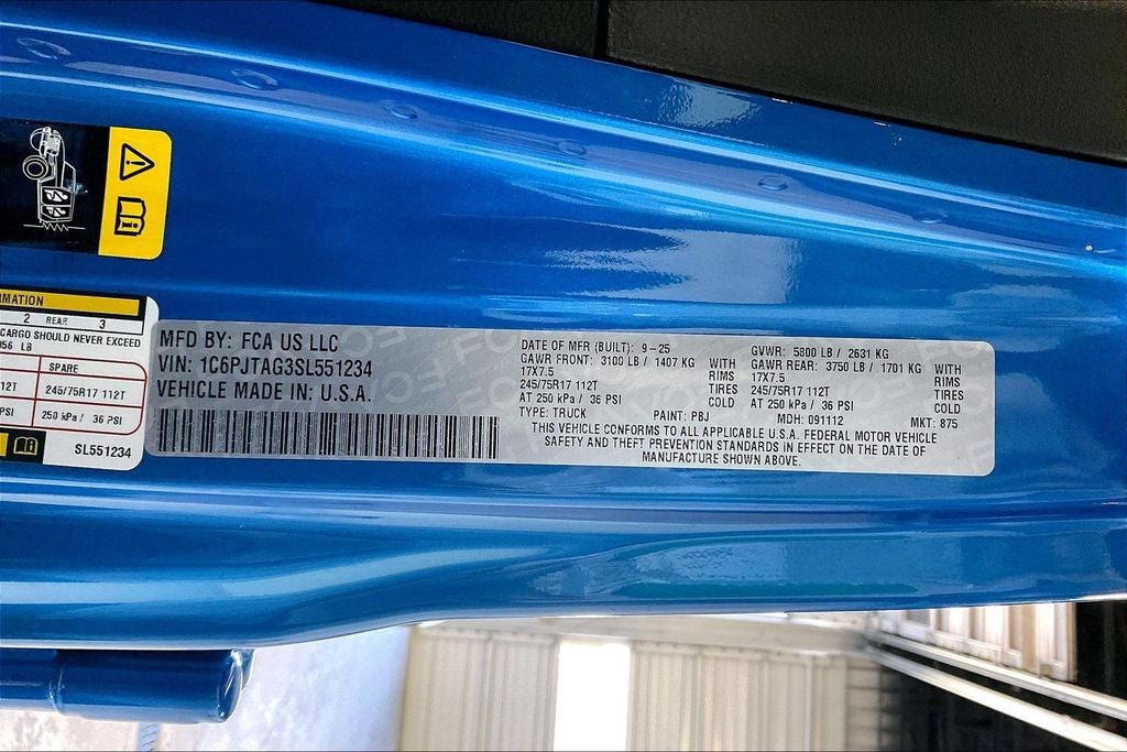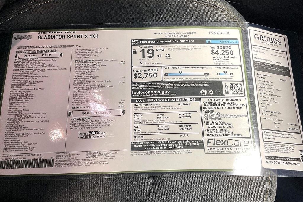 2025 Jeep Gladiator Sport S 4D Crew Cab Sport S Hydro Blue Pearlcoat 4WD 8-Speed Automatic 3.6L V6 24V VVT Gladiator Sport S, 4D Crew Cab, 3.6L V6 24V VVT, 8-Speed Automatic, 4WD, Hydro Blue Pearlcoat, Black Cloth, 110 MPH Vehicle Max Speed Calibration, 12.3 Touchscreen Display, 4G LTE Wi-Fi Hot Spot, 8 Speakers, ABS brakes, Advanced Brake Assist, Air Conditioning, Alexa Built-In, AM/FM radio: SiriusXM, Apple CarPlay, Apple CarPlay/Android Auto, Automatic Headlamps, Body Color 3-Piece Hard Top, Body Color Fender Flares (2-Piece), Brake assist, Compass, Convenience Group, Corning Gorilla Glass, Dark Sky Appearance Package, Daytime Running Lamp System, Deep Tint Sunscreen Windows, Emergency/Assistance Call, Enhanced Adaptive Cruise Control, Freedom Panel Storage Bag, Front Door Locks 2-Door Passive Entry, Front License Plate Bracket, Full Speed Forward Collision Warning Plus, Heated Front Seats, Heated Steering Wheel, Illuminated entry, Mold In Color Bumper w/Gloss Black, Normal Duty Plus Suspension, Normal Duty Suspension, Performance Hood, Power Heated Mirrors, Power steering, Power windows, Premium Wrapped Steering Wheel, Quick Order Package 24S Sport S, Radio data system, Radio: Uconnect 5 w/12.3 Display, Rear Sliding Window, Rear Window Defroster, Remote keyless entry, Remote Start System, Security Alarm, Steering wheel mounted audio controls, Sun Visors w/Illuminated Vanity Mirrors, Traction control, Universal Garage Door Opener, Wheels: 17 x 7.5 Gray.