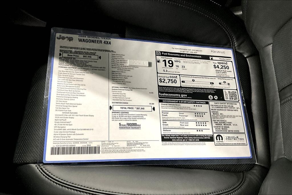 2025 Jeep Wagoneer Base 4D Sport Utility Bright White Clearcoat 4WD 8-Speed Automatic 3.0L I6 4D Sport Utility, 3.0L I6, 8-Speed Automatic, 4WD, Bright White Clearcoat, Black Leather, 10 Speakers, 3 Panel Sunroof, 3rd row seats: bench, ABS brakes, Adjustable Roof Rail Crossbars, Air Conditioning, AM/FM radio: SiriusXM with 360L, Apple CarPlay/Android Auto, Audio memory, Auto-dimming door mirrors, Auto-Dimming Exterior Driver Mirror, Automatic temperature control, Brake assist, Bumpers: body-color, Cargo Cover, Compass, Driver vanity mirror, Driver's Seat Mounted Armrest, Dual front impact airbags, Electronic Stability Control, Exterior Mirrors Approach Lamps, Exterior Mirrors w/Memory, Front Bucket Seats, Front dual zone A/C, Front License Plate Bracket, Memory seat, Navigation System, ParkView Rear Back-Up Camera, Passenger seat mounted armrest, Power driver seat, Power Liftgate, Power passenger seat, Power steering, Power windows, Premium Group I, Quick Order Package 25E, Radio data system, Radio: Uconnect 5 Nav w/10.1 Display, Rear air conditioning, Rear dual zone A/C, Rear window defroster, Remote keyless entry, Reversible Carpet/Vinyl Cargo Mat, Security system, Split folding rear seat, Steering wheel memory, Steering wheel mounted audio controls, Ventilated front seats.