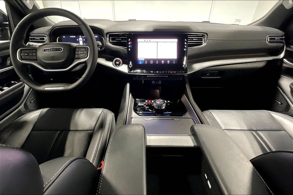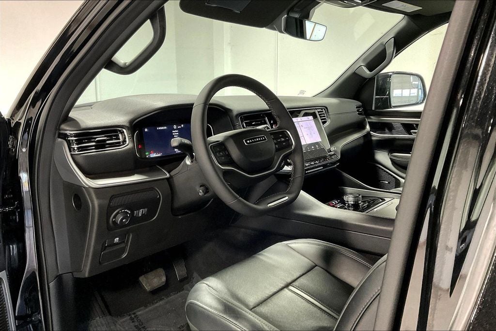 Diamond Black Crystal Pearlcoat 2025 Jeep Wagoneer L Series II 4WD 8-Speed Automatic 3.0L I6 10 Speakers, 118 MPH Maximum Speed Calibration, 3 Panel Sunroof, 3rd row seats: bench, 4-Wheel Disc Brakes, ABS brakes, Adjustable Roof Rail Crossbars, Air Conditioning, Alloy wheels, AM/FM radio: SiriusXM with 360L, Anti-whiplash front head restraints, Apple CarPlay/Android Auto, Audio memory, Auto Adjust In Reverse Exterior Mirrors, Auto-dimming door mirrors, Auto-dimming Rear-View mirror, Auto-leveling suspension, Automatic temperature control, Brake assist, Bumpers: body-color, Carbide Appearance Package, Compass, Driver's Seat Mounted Armrest, Electronic Stability Control, Exterior Mirrors Approach Lamps, Exterior Mirrors w/Memory, Four wheel independent suspension, Front anti-roll bar, Front Bucket Seats, Front dual zone A/C, Front License Plate Bracket, Heated front seats, Heated rear seats, Knee airbag, Memory seat, Navigation System, Normal Duty Suspension, Overhead airbag, ParkView Rear Back-Up Camera, Piano Black Exterior Accents, Power door mirrors, Power driver seat, Power Liftgate, Power passenger seat, Power steering, Power windows, Premium Group I, Quick Order Package 25F Carbide, Radio data system, Radio: Uconnect 5 Nav w/10.1 Display, Rain sensing wipers, Rear air conditioning, Rear window defroster, Reclining 3rd row seat, Remote keyless entry, Reversible Carpet/Vinyl Cargo Mat, Speed control, Speed-sensing steering, Split folding rear seat, Steering wheel memory, Steering wheel mounted audio controls, Traction control, Turn signal indicator mirrors, Variably intermittent wipers, Ventilated front seats, Voltmeter, Wheels: 20 x 9.0 Aluminum Painted Gloss Black.