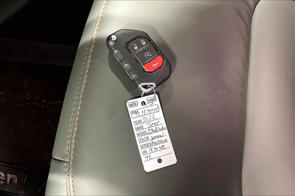Recent Arrival! 2026 Jeep Gladiator Mojave 4D Crew Cab Mojave anvil clearcoat 4WD 8-Speed Automatic 3.6L V6 24V VVT New Feature, Apple CarPlay / Android Auto, Backup camera, Bluetooth®, Heated seats, Leather seats, Navigation system, Remote Start, Gladiator Mojave, 4D Crew Cab, 3.6L V6 24V VVT, 8-Speed Automatic, 4WD, anvil clearcoat, Black Leather, 110 Mph Vehicle Max Speed Calibration, 12.3 Touchscreen Display, 4-Wheel Disc Brakes, 4.10 Rear Axle Ratio, 4G LTE Wi-Fi Hot Spot, 8 Speakers, ABS brakes, Air Conditioning, Alexa Built-in, Alloy wheels, Alpine Premium Audio System, AM/FM radio: SiriusXM with 360L, Apple CarPlay, Apple CarPlay/Android Auto, Auto High Beam Headlamp Control, Auto-Dimming Rear-View Mirror, Automatic temperature control, Blind Spot and Cross Path Detection, Bluetooth® Wireless Speaker, Body Color 3-Piece Hard Top, Body Color Rubicon Highline Flare, Brake assist, Compass, Connectivity - US/Canada, Delay-off headlights, Driver door bin, Driver vanity mirror, Dual front impact airbags, Dual front side impact airbags, Electronic Stability Control, Emergency communication system: Jeep Connect, Freedom Panel Storage Bag, Front anti-roll bar, Front Bucket Seats, Front Center Armrest w/Storage, Front dual zone A/C, Front fog lights, Front License Plate Bracket, Front reading lights, Full Length Floor Console Premium Armrest, Fully automatic headlights, Google Android Auto, Heated door mirrors, Heated Front Seats, Heated Steering Wheel, Heavy Duty Suspension with Gas Shocks, Illuminated entry, Integrated Off-Road Camera, Integrated roll-over protection, Integrated Voice Command with Bluetooth®, Leather Trimmed Bucket Seats, Leather Wrapped Park Brake Handle, Leather Wrapped Shift Knob, Low tire pressure warning, Mojave Top Hood Decal, MOPAR All-Weather Slush Mats, MOPAR Hardtop Headliner, MOPAR Spray in Bedliner, Occupant sensing airbag, Outside temperature display, Overhead airbag, Panic alarm, ParkSense Rear Park Assist System, Passenger door bin, Passenger vanity mirror, Power 4-Way Driver Lumbar Adjust, Power 4-Way Passenger Lumbar Adjust, Power Adjust 8-Way Driver Seat, Power Adjust 8-Way Front Passenger Seat, Power door mirrors, Power steering, Power windows, Premium Cloth Seats with Sport Bolsters, Premium Door Trim Panel, Quick Order Package 24A Mojave X, Radio data system, Radio: Uconnect 5 Navigation with 12.3 Display, Radio: Uconnect 5 with 12.3 Display, Rear anti-roll bar, Rear Armrest with Cupholder Seat, Rear reading lights, Rear Sliding Window, Rear Window Defroster, Remote keyless entry, Security system, Speed control, Split folding rear seat, Steel Front Bumper, Steel Rear Bumper, Steering wheel mounted audio controls, Tachometer, Telescoping steering wheel, Tilt steering wheel, Traction control, Trip computer, Universal Garage Door Opener, USB Host Flip, Variably intermittent wipers, Voltmeter, Wheels: 17 x 7.5 Dark Gray Painted. Price includes: $1000 - 2026 National Retail Bonus Cash . Exp. 03/31/2026