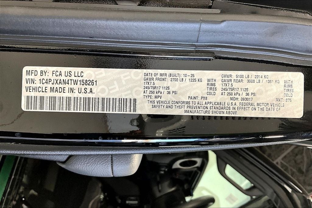 Black Clearcoat 2026 Jeep Wrangler Sport 4WD 8-Speed Automatic 2.0L I4 DOHC New Feature, Wrangler Sport, 2D Sport Utility, 2.0L I4 DOHC, 8-Speed Automatic, 4WD, Black Clearcoat, Black Cloth, 3.45 Overall Top Gear Ratio, 4-Wheel Disc Brakes, 8 Speakers, ABS brakes, Air Conditioning, AM/FM radio: SiriusXM with 360L, Apple CarPlay/Android Auto, Aux Battery, Black 3-Piece Hard Top, Brake assist, Cloth Low-Back Bucket Seats, Compass, Delay-off headlights, Driver door bin, Driver vanity mirror, Dual front impact airbags, Dual front side impact airbags, Electronic Stability Control, Freedom Panel Storage Bag, Front anti-roll bar, Front Bucket Seats, Front Center Armrest w/Storage, Front fog lights, Front reading lights, Illuminated entry, Integrated roll-over protection, Low tire pressure warning, MOPAR All-Weather Floor Mats, No Soft Top, Non-Lock Fuel Cap w/o Discriminator, Normal Duty Suspension, Occupant sensing airbag, Outside temperature display, Overhead airbag, Panic alarm, ParkView Rear Back-Up Camera, Passenger door bin, Passenger vanity mirror, Power steering, Power windows, Quick Order Package 22B Sport, Radio data system, Radio: Uconnect 5 w/12.3 Display, Rear anti-roll bar, Rear reading lights, Rear Window Defroster, Rear Window Wiper/Washer, Remote keyless entry, Speed control, Steering wheel mounted audio controls, Stop-Start Dual Battery System, Tachometer, Telescoping steering wheel, Tilt steering wheel, Traction control, Trip computer, Variably intermittent wipers, Wheels: 17 x 7.5 Black Steel Styled. Price includes: $1000 - 2026 National Select Inventory Bonus Cash . Exp. 01/04/2027