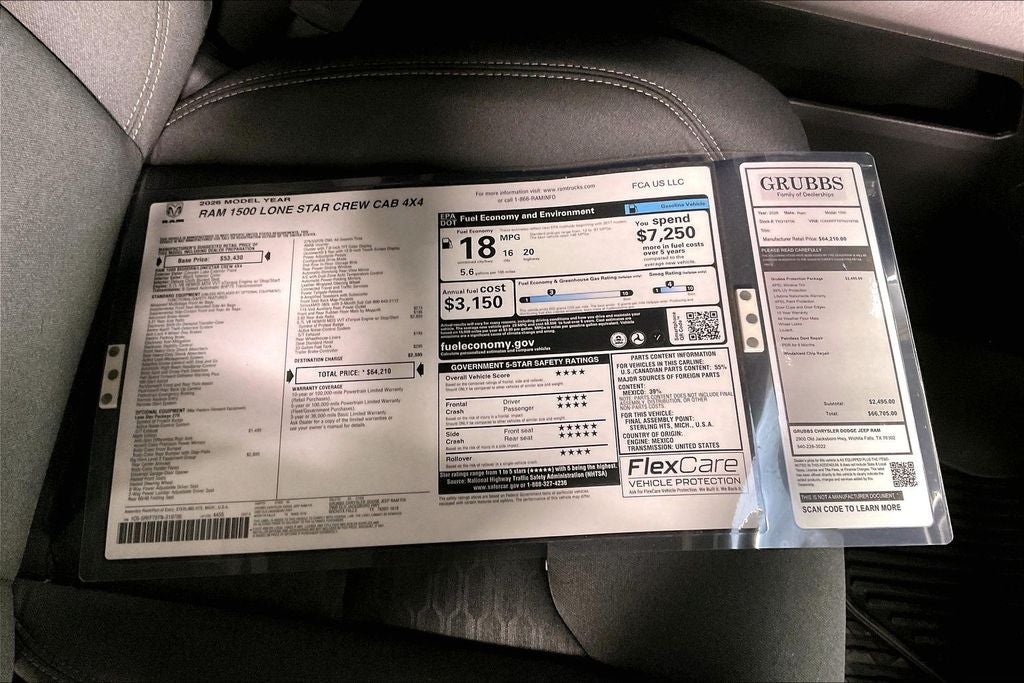 Recent Arrival! 2026 Ram 1500 Big Horn/Lone Star 4D Crew Cab Big Horn/Lone Star Canyon Lake 4WD 8-Speed Automatic HEMI 5.7L V8 Multi Displacement VVT eTorque 1500 Big Horn/Lone Star, 4D Crew Cab, HEMI 5.7L V8 Multi Displacement VVT eTorque, 8-Speed Automatic, 4WD, Canyon Lake, Black Cloth, 115V Auxiliary Power Outlet, 115V Auxiliary Rear Power Outlet, 12 Touchscreen Display, 2nd Row in Floor Storage Bins, 3 Rear Seat Head Restraints, 4 Way Front Headrests, 400W Inverter, 4G LTE Wi-Fi Hot Spot, 6 Speakers, 9 Amplified Speakers with Subwoofer, Accent Color Door Handles, Accent Color Premium Power Mirrors, Accent Color Tailgate Handle, Air Conditioning, Air Conditioning ATC with Dual Zone Control, AM/FM radio, Anti-Spin Differential Rear Axle, Apple CarPlay, Auto Power-Folding Mirrors, Auto-Dimming Exterior Driver Mirror, Auto-Dimming Rear-View Mirror, Big Horn Level 2 Equipment Group, Black Exterior Mirrors, Black Exterior Truck Badging, Black Headlamp Bezels, Black Interior Accents, Black Painted Exterior Mirrors Caps, Black Premium Power Mirrors, Black Tail Lamp Bezels, Body Color Fender Flares, Body Color Front Bumper, Body Color Rear Bumper with Step Pads, Bucket Seats, Center Console Parts Module, Cluster 7.0 TFT Color Display, Configurable Drive Mode, Connected Travel and Traffic Services, Connectivity - US/Canada, Convex Wide-Angle Exterior Mirror Insert, Deluxe Cloth Bucket Seats, Disassociated Touchscreen Display, Dual Exhaust with Black Tips, Exterior Mirrors Courtesy Lamps, Exterior Mirrors with Heating Element, Exterior Mirrors with Supplemental Signals, Front Seat Back Map Pockets, Full Length Floor Console, Global Telematics Box Module, Glove Box Lamp, Google Android Auto, GPS Antenna Input, GPS Navigation, Grille Black Surround Black Mesh, HD Radio, Heated Front Seats, Heated Steering Wheel, Integrated Center Stack Radio, Integrated Voice Command with Bluetooth®, Leather Wrapped Steering Wheel, LED Dome Lamp with on/Off Switch, LED Footwell Lighting, Lone Star Badge, Manual Adjust 4-Way Front Passenger Seat, Media Hub with 2 Charge Only USBs, Night Edition, Overhead LED Lamps, Power 2-Way Driver Lumbar Adjust, Power Adjust 8-Way Driver Seat, Power Adjustable Pedals, Power door mirrors, Power steering, Power windows, Premium Overhead Console, Quick Order Package 27R Lone Star, Radio data system, Radio: Uconnect 5 Navigation with 12.0 Display, Radio: Uconnect 5 W with 8.4 Display, RAM Grille Badge - Black, Rear 60/40 Folding Seat, Rear Center Armrest, Rear Power Sliding Window, Rear Window Defroster, Remote Tailgate Release, Security Alarm, SiriusXM Radio Service, SiriusXM with 360L, Steering Wheel Mounted Audio Controls, Sun Visors with Illuminated Vanity Mirrors, Universal Garage Door Opener, USB Host Flip, Wheels: 20 x 9.0 Aluminum Painted Clad, Wheels: 20 x 9 Aluminum Chrome Clad. Price includes: $1000 - 2026 Southwest BC State of Texas Regional Bonus Cash . Exp. 04/30/2026 $3500 - 2026 National Retail Bonus Cash . Exp. 04/30/2026 $750 - 2026 Southwest BC Retail Bonus Cash . Exp. 04/30/2026