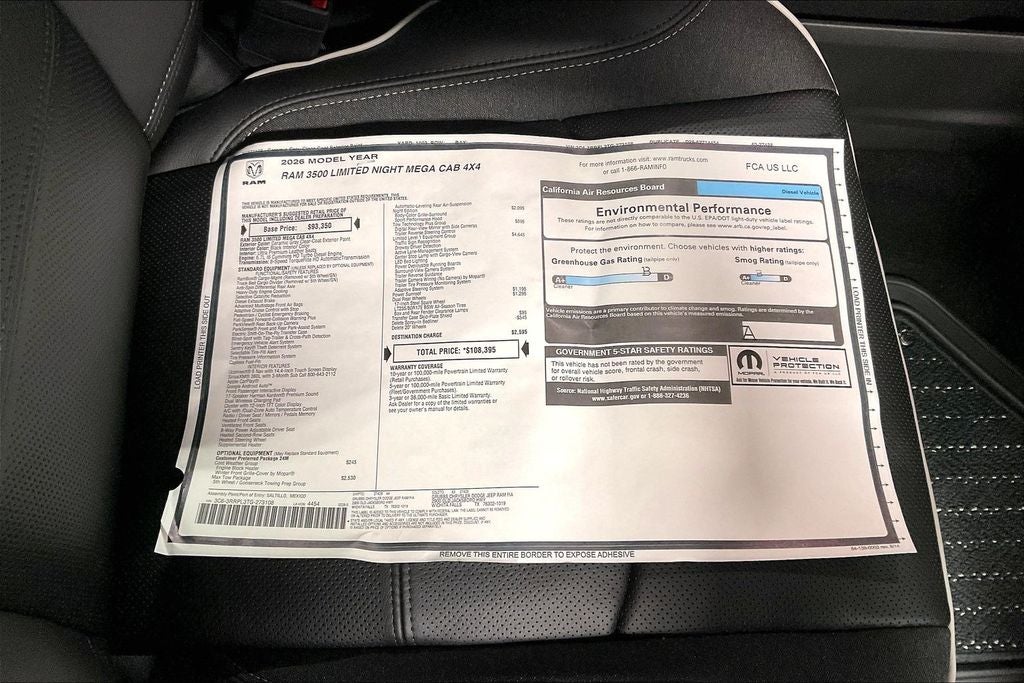 Recent Arrival! 2026 Ram 3500 Limited 4D Mega Cab Limited Ceramic Gray Clearcoat 4WD 8-Speed Automatic 6.7L I6 3500 Limited, 4D Mega Cab, 6.7L I6, 8-Speed Automatic, 4WD, Ceramic Gray Clearcoat, Black Leather, 17 Speakers, 5th Wheel/Gooseneck Towing Prep Group, Active Lane Management System, Adaptive Steering System, Air Conditioning, AM/FM radio: SiriusXM with 360L, Apple CarPlay/Android Auto, Audio memory, Auto Level Rear Air Suspension, Auto-dimming Rear-View mirror, Automatic temperature control, Black Exterior Truck Badging, Black Grille Limited, Black Wheel Center Hub, Body Color Grille Surround, Center Stop Lamp with Cargo View Camera, Cold Weather Group, Digital 3.0 Rear View Auto Dim Mirror, Digital Rearview Mirror, Drowsy Driver Detection, Engine Block Heater, Front Bucket Seats, harman/kardon® Speakers, Heated front seats, Heated rear seats, LED Bed Lighting, Limited Level 1 Equipment Group, Max Tow Package, Memory seat, MOPAR Spray in Bedliner, MOPAR Trailer Camera Wiring with No Camera, MOPAR Winter Front Grille Cover, Navigation System, Night Edition, Pedal memory, Pickup Box, Power Deployable Running Boards, Power driver seat, Power passenger seat, Power steering, Power Sunroof, Power windows, Quick Order Package 24M Limited, Radio data system, Radio: Uconnect 5 Nav with 14.4 Display, Remote keyless entry, Split folding rear seat, Sport Performance Hood, Surround View Camera System, Tow Technology Plus Group, Traffic Sign Recognition, Trailer Reverse Guidance, Trailer Reverse Steering Control, Trailer Tire Pressure Monitoring System, Vendor Painted Cargo Box, Vendor Painted Cargo Box Tracking, Ventilated front seats. Price includes: $1000 - 2026 National Bonus Cash . Exp. 04/30/2026 $2000 - 2026 Southwest BC State of Texas Regional Bonus Cash . Exp. 04/30/2026