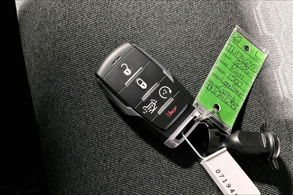 Recent Arrival! 2026 Ram 1500 Big Horn/Lone Star 4D Crew Cab Big Horn/Lone Star Granite Crystal Metallic Clearcoat 4WD 8-Speed Automatic 3.0L I6 1500 Big Horn/Lone Star, 4D Crew Cab, 3.0L I6, 8-Speed Automatic, 4WD, Granite Crystal Metallic Clearcoat, Black Cloth, 115V Auxiliary Power Outlet, 115V Auxiliary Rear Power Outlet, 12 Touchscreen Display, 2nd Row in Floor Storage Bins, 3 Rear Seat Head Restraints, 4 Way Front Headrests, 400W Inverter, 4G LTE Wi-Fi Hot Spot, 6 Speakers, 9 Amplified Speakers with Subwoofer, Accent Color Door Handles, Accent Color Premium Power Mirrors, Accent Color Tailgate Handle, Air Conditioning ATC with Dual Zone Control, AM/FM radio, Anti-Spin Differential Rear Axle, Apple CarPlay, Auto Power-Folding Mirrors, Auto-Dimming Exterior Driver Mirror, Auto-Dimming Rear-View Mirror, Big Horn Level 2 Equipment Group, Black Exterior Mirrors, Black Exterior Truck Badging, Black Headlamp Bezels, Black Interior Accents, Black Painted Exterior Mirrors Caps, Black Premium Power Mirrors, Black Tail Lamp Bezels, Body Color Fender Flares, Body Color Front Bumper, Body Color Rear Bumper with Step Pads, Bucket Seats, Center Console Parts Module, Cluster 7.0 TFT Color Display, Configurable Drive Mode, Connected Travel and Traffic Services, Connectivity - US/Canada, Convex Wide-Angle Exterior Mirror Insert, Deluxe Cloth Bucket Seats, Disassociated Touchscreen Display, Dome Dual LED Reading Lamp, Dual Exhaust with Black Tips, Dual-Pane Panoramic Sunroof, Exterior Mirrors Courtesy Lamps, Exterior Mirrors with Heating Element, Exterior Mirrors with Supplemental Signals, Front Seat Back Map Pockets, Full Length Floor Console, Global Telematics Box Module, Glove Box Lamp, Google Android Auto, GPS Antenna Input, GPS Navigation, Grille Black Surround Black Mesh, HD Radio, Heated Front Seats, Heated Steering Wheel, Integrated Center Stack Radio, Integrated Voice Command with Bluetooth®, Leather Wrapped Steering Wheel, LED Dome Lamp with on/Off Switch, LED Footwell Lighting, Lone Star Badge, Manual Adjust 4-Way Front Passenger Seat, Media Hub with 2 Charge Only USBs, Night Edition, Overhead LED Lamps, Power 2-Way Driver Lumbar Adjust, Power Adjust 8-Way Driver Seat, Power Adjustable Pedals, Premium Overhead Console, Quick Order Package 21R Lone Star, Radio data system, Radio: Uconnect 5 Navigation with 12.0 Display, Radio: Uconnect 5 W with 8.4 Display, RAM Grille Badge - Black, Rear 60/40 Folding Seat, Rear Center Armrest, Rear Power Sliding Window, Rear Window Defroster, Remote Tailgate Release, Security Alarm, SiriusXM Radio Service, SiriusXM with 360L, Steering Wheel Mounted Audio Controls, Sun Visors with Illuminated Vanity Mirrors, Universal Garage Door Opener, USB Host Flip, Wheels: 20 x 9.0 Aluminum Painted Clad, Wheels: 20 x 9 Aluminum Chrome Clad. Price includes: $1000 - 2026 Southwest BC State of Texas Regional Bonus Cash . Exp. 03/31/2026 $3500 - 2026 National Retail Bonus Cash . Exp. 03/31/2026 $750 - 2026 Southwest BC Retail Bonus Cash . Exp. 03/31/2026