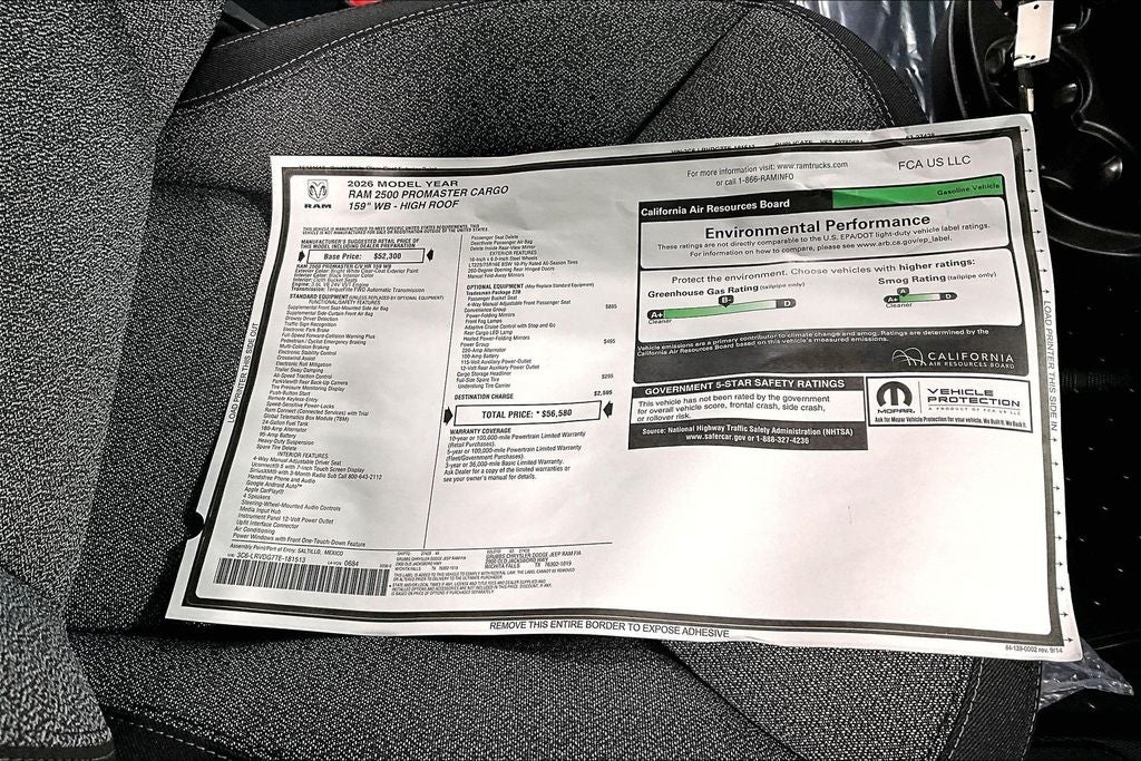Recent Arrival! 2026 Ram ProMaster 2500 High Roof 3D Cargo Van High Roof Bright White Clearcoat FWD 9-Speed Automatic 3.6L V6 24V VVT ProMaster 2500 High Roof, 3D Cargo Van, 3.6L V6 24V VVT, 9-Speed Automatic, FWD, Bright White Clearcoat, Black Cloth, 100 Amp Battery, 115V Auxiliary Power Outlet, 12V Rear Auxiliary Power Outlet, 4 Speakers, 4-Way Manual Adjust Front Passenger Seat, Air Conditioning, Convenience Group, Exterior Mirrors with Heating Element, Exterior Mirrors with Supplemental Signals, For Details, Visit DriveUconnect.com, For More Info, Call 800-643-2112, Front Fog Lamps, Front reading lights, Passenger Bucket Seat, Power Adjust Mirrors, Power Folding/Heated Mirrors, Power Group, Power steering, Power windows, Power-Adjustable Convex Aux Mirrors, Power-Folding Mirrors, Quick Order Package 22B Tradesman, Radio: Uconnect 5 with 7 Display, Rear Cargo LED Lamp, Remote keyless entry, SiriusXM Radio Service. Price includes: $4000 - 2026 National Bonus Cash . Exp. 03/31/2026