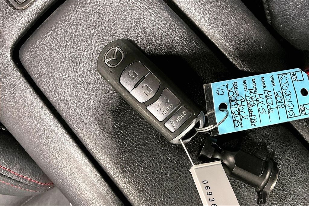 New Price! 2018 Mazda Miata Grand Touring Grand Touring Jet Black Mica 2D Convertible RWD I4 6-Speed Automatic Sport New Feature, Miata Grand Touring, 2D Convertible, I4, 6-Speed Automatic Sport, RWD, Jet Black Mica, Black W/Red Stitching Leather, 4-Wheel Disc Brakes, 9 Speakers, ABS brakes, Air Conditioning, Alloy wheels, AM/FM radio: SiriusXM, AM/FM/CD/MP3 w/Navigation, Auto High-beam Headlights, Auto-dimming door mirrors, Auto-dimming Rear-View mirror, Automatic temperature control, BOSE Audio System, Brake assist, Bumpers: body-color, CD player, Convertible roof lining, Convertible roof wind blocker, Delay-off headlights, Driver vanity mirror, Dual front impact airbags, Dual front side impact airbags, Electronic Stability Control, Emergency communication system: MAZDA CONNECT, Four wheel independent suspension, Front anti-roll bar, Front Bucket Seats, Front Center Armrest, Fully automatic headlights, Garage door transmitter: HomeLink, Glass rear window, Heated door mirrors, Heated front seats, Illuminated entry, Leather Shift Knob, Leather Upholstery, Low tire pressure warning, MAZDA CONNECT Infotainment System, Navigation System, Occupant sensing airbag, Outside temperature display, Panic alarm, Passenger vanity mirror, Power door mirrors, Power steering, Power windows, Radio data system, Rain sensing wipers, Rear anti-roll bar, Rear window defroster, Reclining Heated Front Bucket Seats, Remote keyless entry, Security system, Speed control, Speed-sensing steering, Sport steering wheel, Steering wheel mounted audio controls, Tachometer, Tilt steering wheel, Traction control, Trip computer, Variably intermittent wipers, Wheels: 17 x 7 Dark Silver Aluminum Alloy.