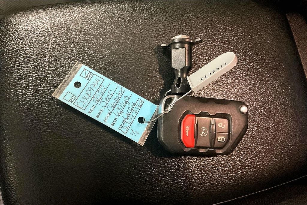 2022 Jeep Gladiator Willys Willys Sting-Gray Clearcoat 4D Crew Cab 4WD 3.6L V6 24V VVT 8-Speed Automatic Gladiator Willys, 4D Crew Cab, 3.6L V6 24V VVT, 8-Speed Automatic, 4WD, Sting-Gray Clearcoat, Black Cloth, 110 MPH Vehicle Max Speed Calibration, 2-Door Passive Entry, Front Door Locks, 240 Amp Alternator, 4-Wheel Drive Decal, 700 Amp Maintenance Free Battery, 97 MPH Vehicle Max Speed Calibration, Air Conditioning, Air Conditioning w/Auto Temperature Control, Anti-Spin Differential Rear Axle, Apple CarPlay, Apple CarPlay/Android Auto, Automatic Headlamps, Auxiliary Switch Group, Auxiliary Switches, Black Grille, Body Color Fender Flares (2-Piece), Bridgestone Brand Tires, Class IV Receiver Hitch, Cluster 7.0 TFT Color Display, Cold Weather Group, Convenience Group, Daytime Running Lamp System, Deep Tint Sunscreen Windows, For More Info, Call 800-643-2112, Front 1-Touch Down Power Windows, Front Heavy Duty Red Accent Shock Absorbers, GPS Antenna Input, Heated Front Seats, Heated Steering Wheel, Heavy-Duty Engine Cooling, Leather Wrapped Steering Wheel, Mold In Color Bumper w/Gloss Black, MOPAR All-Weather Slush Mats, Power Heated Mirrors, Power Tailgate Lock, Protection Sill Rails, Quick Order Package 24W Willys, Radio data system, Rear Heavy Duty Red Accent Shock Absorbers, Remote Keyless Entry, Security Alarm, SiriusXM Radio Service, SiriusXM Satellite Radio, Speed Sensitive Power Locks, Sun Visors w/Illuminated Vanity Mirrors, Technology Group, Trailer Hitch Zoom, Trailer Tow Package, Universal Garage Door Opener, Wheels: 17 x 7.5 Black Aluminum w/Gray Pad, Willys, Willys Hood Decal.