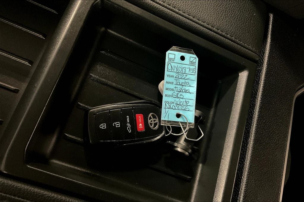 2022 Toyota Tundra SR5 SR5 White 4D Double Cab RWD 3.4L V6 10-Speed Automatic 1 Owner, Tundra SR5, 4D Double Cab, 3.4L V6, 10-Speed Automatic, RWD, White, Black Cloth, 18 x 8 Alloy Wheels, 3.31 Axle Ratio, 4-Wheel Disc Brakes, 6 Speakers, ABS brakes, Air Conditioning, Alloy wheels, AM/FM Radio, AM/FM radio: SiriusXM, Apple CarPlay/Android Auto, Auto High-beam Headlights, Automatic temperature control, Brake assist, Bumpers: body-color, Delay-off headlights, Driver door bin, Driver vanity mirror, Dual front impact airbags, Dual front side impact airbags, Electronic Stability Control, Emergency communication system: Safety Connect with 1-year trial, Exterior Parking Camera Rear, Fabric Seat Trim, Front anti-roll bar, Front Bucket Seats, Front Center Armrest, Front fog lights, Front reading lights, Front wheel independent suspension, Fully automatic headlights, Heated door mirrors, Illuminated entry, Knee airbag, Low tire pressure warning, Occupant sensing airbag, Outside temperature display, Overhead airbag, Overhead console, Panic alarm, Passenger door bin, Passenger vanity mirror, Power door mirrors, Power steering, Power windows, Radio data system, Rear reading lights, Rear step bumper, Rear window defroster, Remote keyless entry, Security system, Speed control, Speed-sensing steering, Split folding rear seat, Steering wheel mounted audio controls, Tachometer, Telescoping steering wheel, Tilt steering wheel, Traction control, Trip computer, Turn signal indicator mirrors, Variably intermittent wipers, Voltmeter.