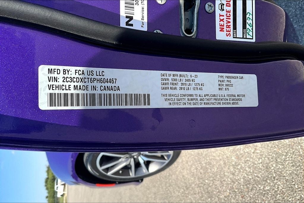 New Price! 2023 Dodge Charger R/T R/T Plum Crazy Pearlcoat 4D Sedan RWD HEMI 5.7L V8 Multi Displacement VVT 8-Speed Automatic 1 Owner, New Feature, Charger R/T, 4D Sedan, HEMI 5.7L V8 Multi Displacement VVT, 8-Speed Automatic, RWD, Plum Crazy Pearlcoat, Black Cloth, 1-Yr SiriusXM Guardian Trial, 2-Piece Shark Fin Antenna, 4-Wheel Disc Brakes, 4G LTE Wi-Fi Hot Spot, 6 Speakers, 8.4 Touchscreen Display, ABS brakes, Air Conditioning, Alloy wheels, AM/FM radio: SiriusXM, Anti-whiplash front head restraints, Apple CarPlay, Apple CarPlay/Android Auto, Auto-dimming Rear-View mirror, Automatic temperature control, Brake assist, Bumpers: body-color, Cloth Performance Seats, Compass, Delay-off headlights, Driver door bin, Driver vanity mirror, Dual front impact airbags, Dual front side impact airbags, Electronic Stability Control, Emergency communication system: SiriusXM Guardian, For Details, Visit DriveUconnect.com, Four wheel independent suspension, Front anti-roll bar, Front Bucket Seats, Front Center Armrest, Front dual zone A/C, Front License Plate Bracket, Front reading lights, Fully automatic headlights, Garage door transmitter: HomeLink, Google Android Auto, GPS Antenna Input, HD Radio, Heated door mirrors, Illuminated entry, Integrated Center Stack Radio, Integrated Voice Command w/Bluetooth®, Knee airbag, Leather Shift Knob, Low tire pressure warning, Manufacturer's Statement of Origin, Media Hub (2 USB, AUX), Occupant sensing airbag, Outside temperature display, Overhead airbag, Overhead console, Panic alarm, ParkView Rear Back-Up Camera, Passenger door bin, Passenger vanity mirror, Power 2-Way Driver Lumbar Adjust, Power 8-Way Driver Seat, Power door mirrors, Power driver seat, Power steering, Power windows, Quick Order Package 26N, Radio: Uconnect 4C w/8.4 Display, Rear anti-roll bar, Rear Armrest w/Cupholder Seat, Rear reading lights, Rear seat center armrest, Rear window defroster, Remote keyless entry, Speed control, Speed-Sensitive Wipers, Split folding rear seat, Spoiler, Sport steering wheel, Steering wheel mounted audio controls, Tachometer, Telescoping steering wheel, Tilt steering wheel, Traction control, Trip computer, USB Host Flip, Variably intermittent wipers, Wheels: 20 x 8 Machined w/Granite Pocket.