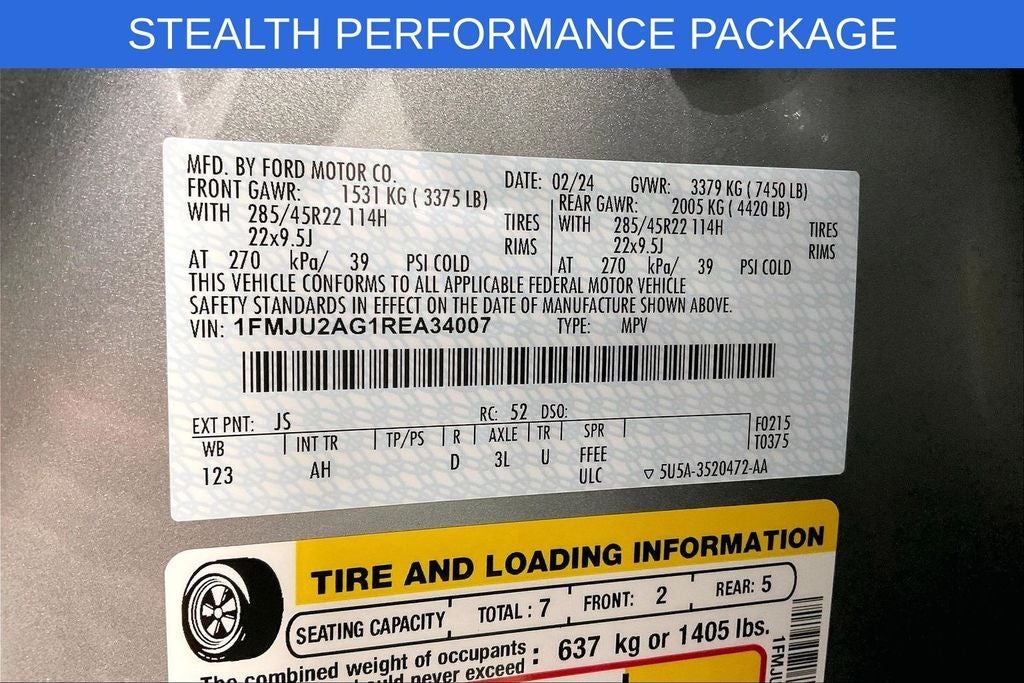 2024 Ford Expedition Limited Limited Iconic Silver Metallic 4D Sport Utility 4WD 3.5L V6 10-Speed Automatic 1 Owner, New Feature, Apple CarPlay / Android Auto, Backup camera, Blind Spot Monitoring, Bluetooth®, Heated seats, Leather seats, Navigation system, Remote Start, Sunroof / Moonroof, Third-row seating, Expedition Limited, 4D Sport Utility, 3.5L V6, 10-Speed Automatic, 4WD, Iconic Silver Metallic, Black Onyx Leather, 12 Speakers, 15.5 LCD Capacitive Touchscreen, 1st & 2nd Row Floor Liners w/Carpet Mats, 1st & 2nd Row Floor Mats w/Logo, 26mm Engine Radiator, 360-Degree Camera w/Split View, 360-Degree Camera w/Trailer Reverse Guidance, 3rd row seats: split-bench, 4-Wheel Disc Brakes, ABS brakes, Active Noise Control, Adjustable pedals, Air Conditioning, Alloy wheels, AM/FM radio: SiriusXM with 360L, Auto High-beam Headlights, Auto-dimming door mirrors, Auto-dimming Rear-View mirror, Automatic temperature control, Black Headlamp and Fog Lamp Bezels, Black Limited Tailgate Badge, Black Roof Rack Side Rails, Body Color Door Handles, Brake assist, Bumpers: body-color, Compass, Connected Navigation, Delay-off headlights, Driver door bin, Driver vanity mirror, Dual Exhaust System, Dual front impact airbags, Dual front side impact airbags, Ebony Black Bar and Mesh Grille, Ebony Black Power Deployable Running Boards, Ebony Black Tailgate Applique, Electronic Stability Control, Emergency communication system: SYNC 4 911 Assist, Engine Block Heater, Equipment Group 304A Stealth Performance Package, Expedition Lettering on Hood, Exterior Parking Camera Rear, Four wheel independent suspension, Front anti-roll bar, Front Bucket Seats, Front Center Armrest, Front dual zone A/C, Front fog lights, Front License Plate Bracket, Front reading lights, Front Tow Hooks, Fully automatic headlights, Garage door transmitter, Heated & Ventilated Leather Front Captain's Chairs, Heated door mirrors, Heated front seats, Heated rear seats, Heated steering wheel, Heated/Ventilated Lthr Front Captain's Chairs (A), Heavy-Duty Trailer Tow Package, Illuminated entry, Instrument Panel Cluster, Integrated Trailer Brake Controller, Leather steering wheel, LED Taillamp w/Black Bezels, Low tire pressure warning, Memory seat, Navigation system: Connected Navigation, Occupant sensing airbag, Outside temperature display, Overhead airbag, Overhead console, Panic alarm, Passenger door bin, Passenger vanity mirror, Pedal memory, Power door mirrors, Power driver seat, Power Liftgate, Power moonroof, Power passenger seat, Power steering, Power windows, Power-Folding Sideview Mirrors w/Autofold, Pro Trailer Backup Assist, Radio data system, Radio: B&O Sound System by Bang & Olufsen, Radio: B&O Unleashed Sound System by Bang & Olufsen, Rain sensing wipers, Rear air conditioning, Rear anti-roll bar, Rear reading lights, Rear window defroster, Rear window wiper, Reclining 3rd row seat, Red Brake Calipers, Remote keyless entry, Reverse Brake Assist, Security system, SiriusXM w/360L, Speed control, Speed-sensing steering, Speed-Sensitive Wipers, Split folding rear seat, Spoiler, Sport Center Console, Sport Tuned Suspension, Sport-Tuned Suspension, Stealth Performance Edition Package, Steering wheel memory, Steering wheel mounted audio controls, SYNC 4 w/Enhanced Voice Recognition, SYNC 4A w/Enhanced Voice Recognition, Tachometer, Telescoping steering wheel, Tilt steering wheel, Traction control, Trip computer, Turn signal indicator mirrors, Variably intermittent wipers, Ventilated front seats, Voltmeter, Wheels: 20 Bright Machined Aluminum, Wheels: 22 Premium Black-Painted Aluminum.