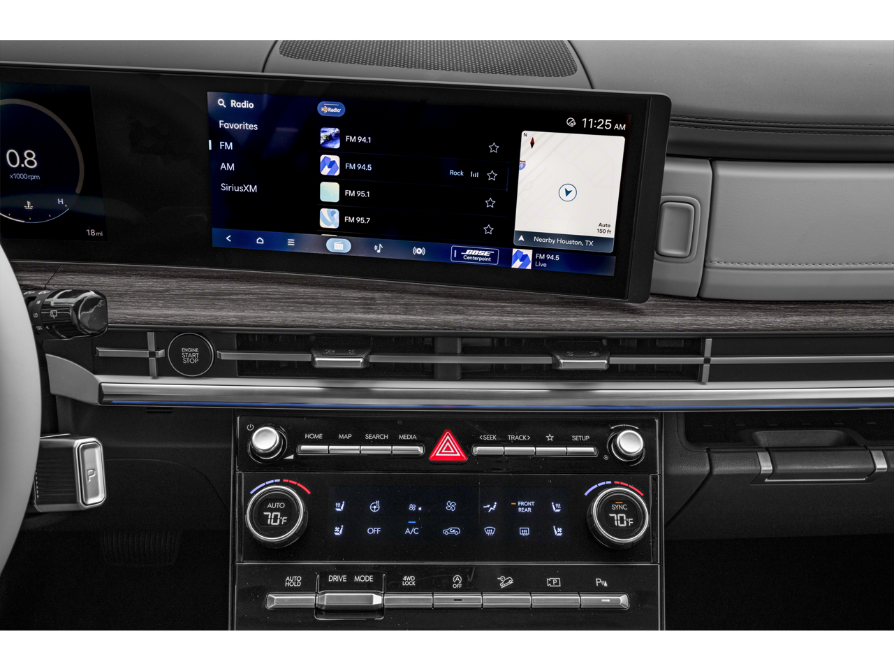 - Radio: AM/FM/HD Bose Premium Audio System -inc: 12 speakers including subwoofer, external amplifier, 12.3" wide touchscreen, Apple CarPlay and Android Auto, Bluetooth® hands-free w/wireless audio streaming, dynamic voice recognition, USB connectivity, SiriusXM, Blue Link connected car system, navigation system including traffic flow w/incident data via HD Radio (HERE) and rear seat quiet mode